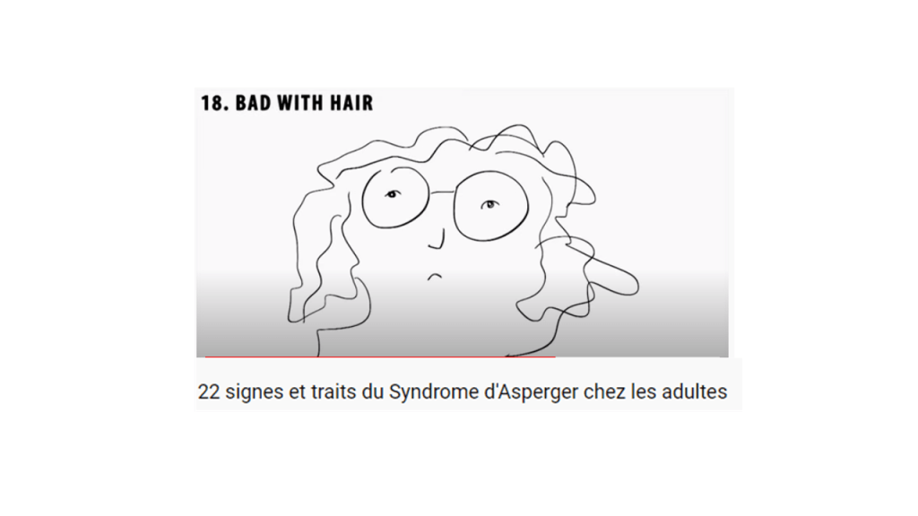 Je suis tombée sur une vidéo intitulée « 22 signes et traits du Syndrome d’Asperger chez les adultes», dont la slide # 18 « Bad with hair : you just can’t do it», a retenu toute mon attention. En effet, je m’y suis complètement reconnue. https://youtu.be/Hb21GwY6ysc