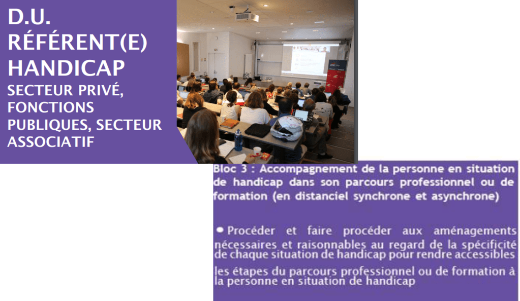 Chargée d’enseignement vacataire : cours/sensibilisation à l’autisme pour les élèves du diplôme universitaire « Référent handicap », sur le thème : « Accompagnement de la personne autiste dans son parcours professionnel »