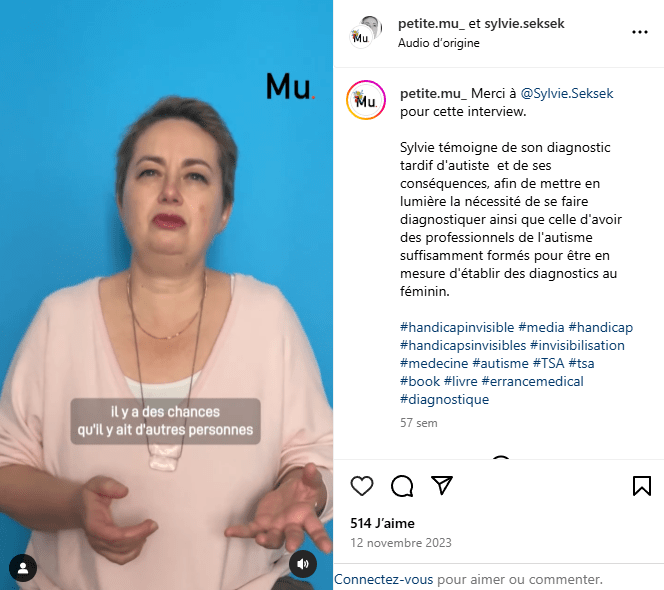 Interview dans l’émission des Experts Autisme sur la radio VIVRE FM, intitulée « Etre une femme autiste » https://www.vivrefm.com/posts/2022/11/etre-une-femme-autiste
